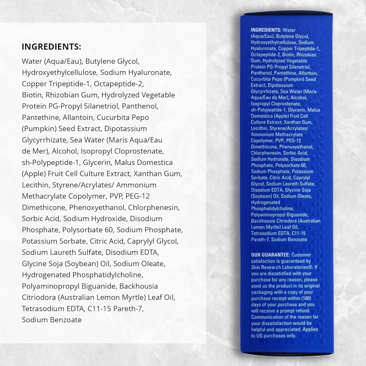 Water (Aqua/Eau), Butylene Glycol, Hydroxyethylcellulose, Sodium Hyaluronate, Copper Tripeptide-1, Octapeptide-2, Biotin, Rhizobian Gum,Hydrolyzed Vegetable Protein PG-Propyl Silanetriol, Panthenol, Pantethine, Allantoin, Cucurbita Pepo (Pumpkin) Seed Extract, Dipotassium Glycyrrhizate, Sea Water (Maris Aqua/Eau de Mer), Alcohol, lsopropyl Cloprostenate, sh-Polypeptide-1, Glycerin, Malus Domestica (Apple) Fruit Cell Culture Extract, Xanthan Gum, Lecithin, Styrene/Acrylates/Ammonium Methacrylate Copolymer, PVP, PEG-12 Dimethicone, Phenoxyethanol, Chlorphenesin, Sorbic Acid, Sodium Hydroxide, Disodium Phosphate, Polysorbate 60, Sodium Phosphate, Potassium Sorbate, Citric Acid, Caprylyl Glycol, Sodium Laureth Sulfate, Disodium EDTA, Glycine Soja (Soybean) Oil, Sodium Oleate, Hydrogenated Phosphatidylcholine, Polyaminopropyl Biguanide, Backhousia Citriodora (Australian Lemon Myrtle) Leaf Oil, Tetrasodium EDTA, C11-15 Pareth-7, Sodium Benzoate